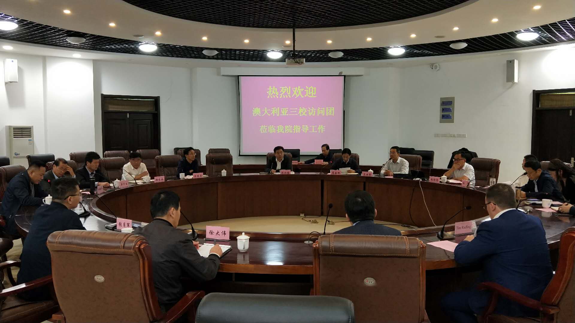2018年10月10日下午三点,澳大利亚三校访问团以及中国太阳能源有限公司董事长、香港优才专才协会副会长张月军先生一行,专程来我院参观指导,我院所有中层以上领导干部在6号楼3楼会议室与澳方进行座谈。