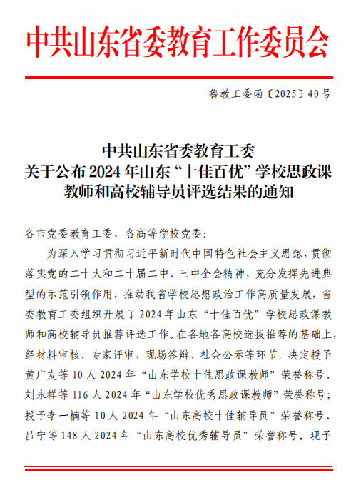 近日,中共山东省委教育工委公布2024年“十佳百优”学校思政课教师和高校辅导员评选结果,我校辅导员岳鑫鑫老师获评“山东高校优秀辅导员”称号。