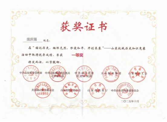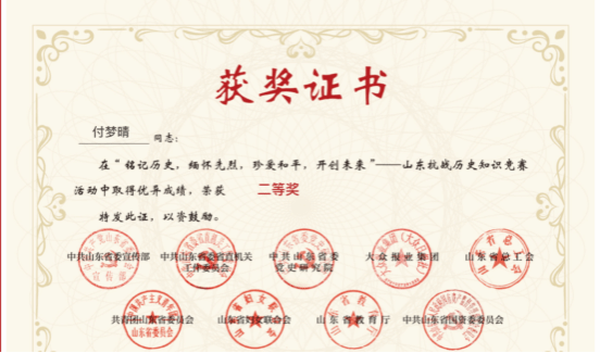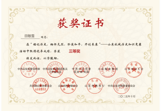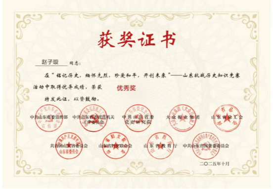 近日,由山东省委宣传部、山东省委省直机关工委、山东省委党史研究院、大众报业集团、山东省总工会、共青团山东省委、山东省妇女联合会、山东省教育厅、山东省国资委联合发起,山东省互联网传媒集团承办的“山东抗战历史知识竞赛”圆满落幕。在校团委的精心组织与广泛发动下,各院(系)师生踊跃参与、认真备赛,共有249名师生获奖。其中,4人荣获一等奖,18人荣获二等奖,85人荣获三等奖,142人荣获优秀奖。向所有获奖师生表示祝贺!