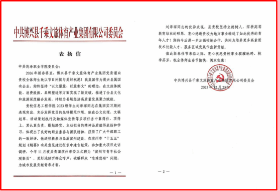 近日,中共博兴县千乘文旅体育产业集团有限公司委员会发来感谢信,高度认可我校信息工程学院2023级学生刘泽琛实习期间的优异表现,同时对我校人才培养成效予以肯定。