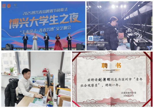 实习期间,刘泽琛深度参与公文处理、活动策划、融媒体宣传等核心工作,以严谨务实的作风赢得同事与领导的一致认可。他主动承担大型活动主持任务,先后主持“博兴大学生之夜文艺晚会”“2025‘黄河大集’”等活动,单场直播量达5万人次,有效扩大了活动的社会影响力。同时,他积极参与滨州市“十五五”规划《纲要》意见征集,随队深入重大项目一线调研,以青年视角贡献力量。2025年11月,凭借突出表现,刘泽琛获评首批“滨州市青年社会观察员”,围绕青年发展型城市建设产业体系智改数转等领域建言献策,以青春行动赋能地方发展。