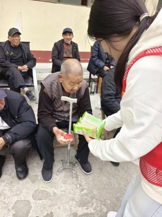 文艺表演结束后,活动进入了另一个温馨环节。建筑工程系志愿者们将提前准备好的爱心慰问品——面包和饼干,送到每一位老人手中。在发放过程中,老师、同学们与老人们亲切交谈,了解他们的身体和生活状况并送上节日的祝福。