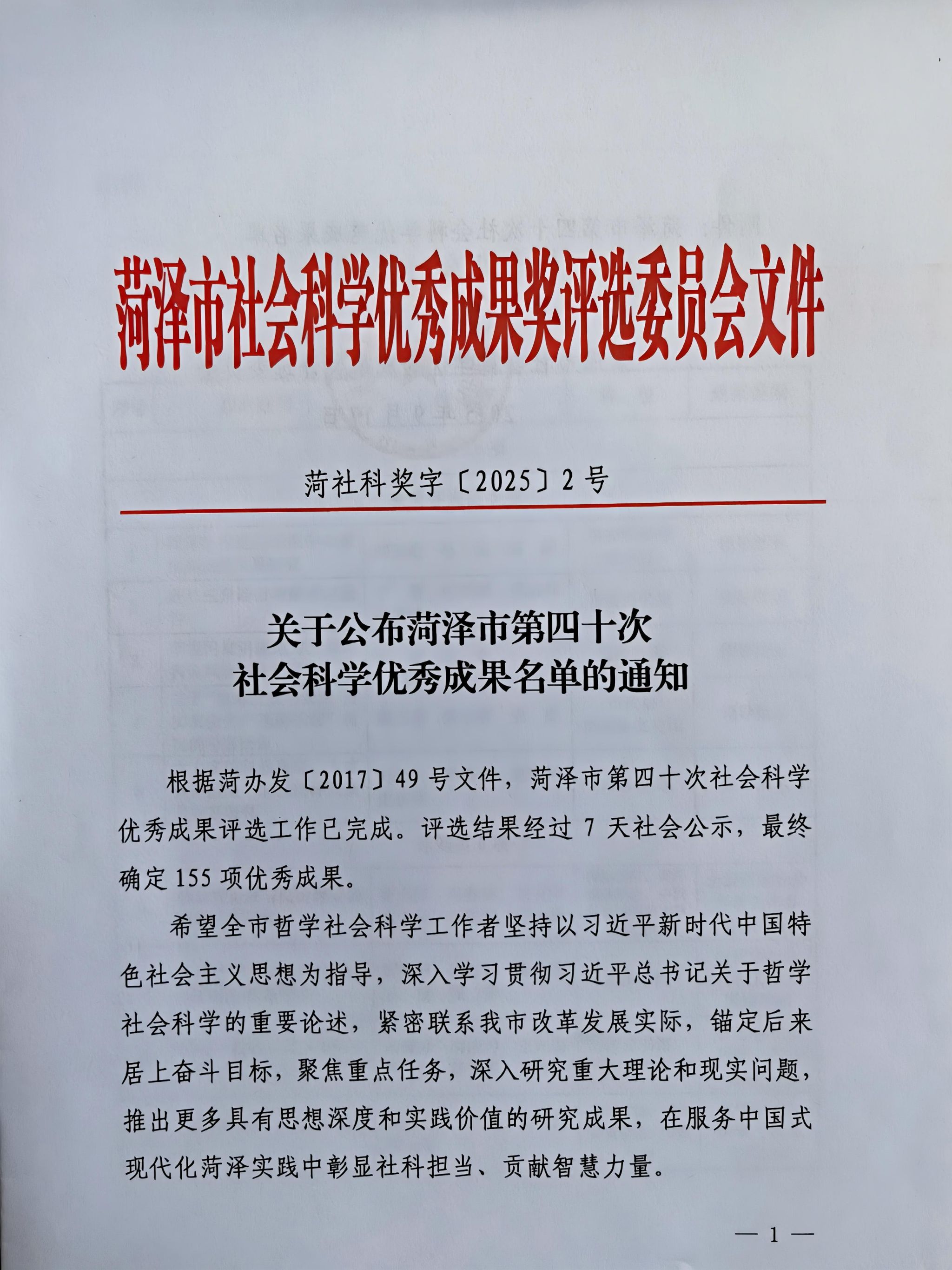 近日,菏泽市社会科学界联合会印发了《关于公布菏泽市第四十次社会科学优秀成果名单的通知》(菏社科奖字〔2025〕2号),我校教职工共荣获菏泽市社会科学优秀成果奖5项,其中二等奖1项,三等奖4项。此成果奖为市委、市政府颁发的社会科学研究最高奖项。