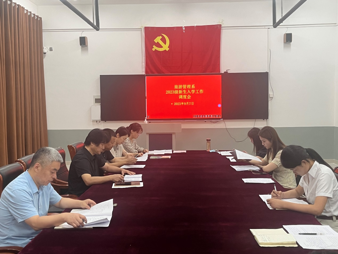 为做好2023级新生入学报到工作和新学期教学工作,旅游管理系于9月7日下午在3203会议室召开了迎新工作调度及教育教学研讨会,旅游管理系党总支书记周宝玉,副书记李海东,副主任孙超、冯春英、刘晨阳出席,所有任课教师、辅导员、新生班主任参加会。