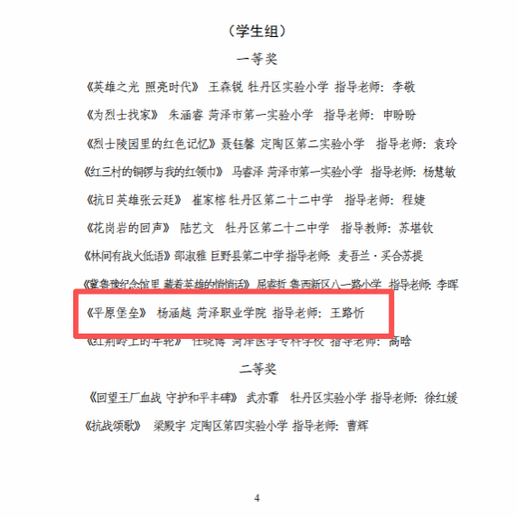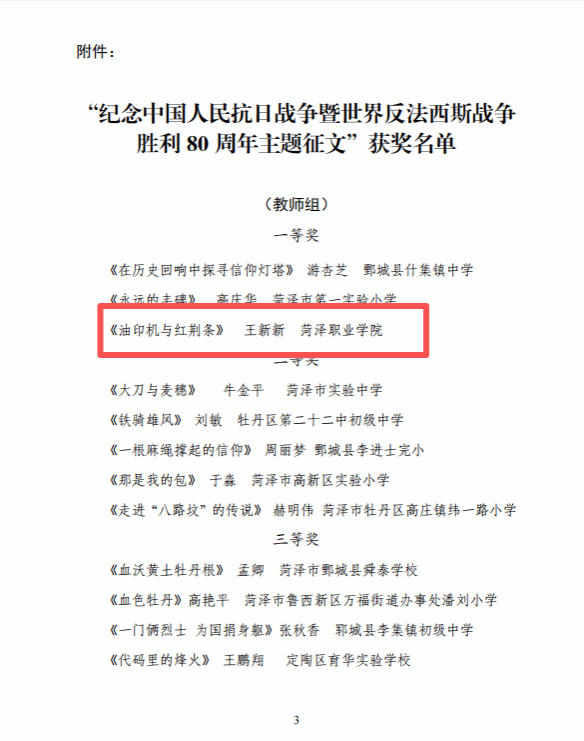 近日,在中共菏泽市委教育工作委员会、菏泽市教育系统文学艺术界联合会联合举办的“纪念中国人民抗日战争暨世界反法西斯战争胜利80周年主题征文大赛”中,我校师生表现优异,共斩获一等奖2项、三等奖1项,学校荣获“优秀组织奖”,充分展现了我校师生深厚的爱国情怀与昂扬的精神风貌。