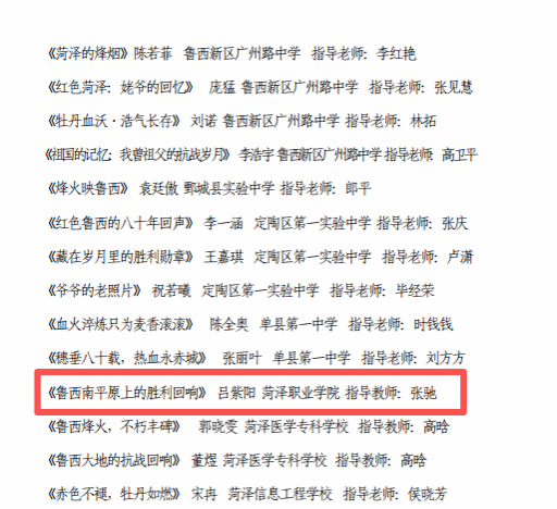 本次大赛面向全市大中小学师生,共征集学生稿件387篇、教师稿件126篇。经专家评审,我校王新新老师凭借作品《油印机与红荆条》荣获教师组一等奖,杨涵越同学的作品《平原堡垒》、吕紫阳同学的作品《鲁西南平原上的胜利回响》分别荣获学生组一等奖、三等奖。