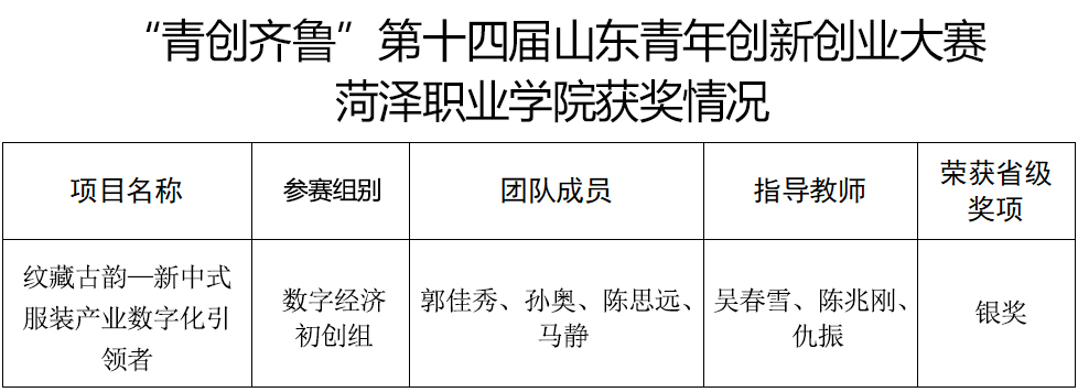 本届大赛聚焦科技创新和数字经济两大专项,全面展示我省青年创业者在前沿领域的创新突破和对商业机遇的敏锐捕捉。大赛自7月份启动以来,在全省16地市及130余所高校、企业中广泛开展,共有1520个项目报名参赛。经过层层选拔,大赛最终产生金奖12个、银奖18个、铜奖27个。我校商贸物流系“纹藏古韵—新中式服装产业数字化引领者”项目团队与省内本科院校及企业创业者同台竞技,历经复赛和决赛的激烈角逐,最终斩获数字经济专项初创组银奖的优异成绩!