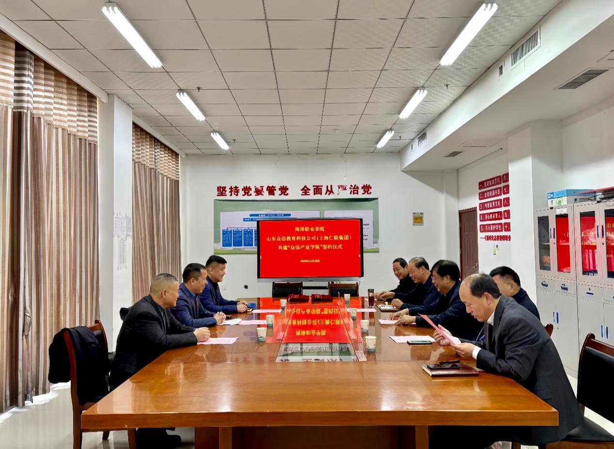 2023年12月20日下午,菏泽职业学院与上海仁联集团直属公司——山东众信教育科技有限公司共建“众信产业学院”签约仪式在我校举行。出席本次签约仪式的有学校党委副书记、院长袁宗建,学校党委副书记胡宪奎,学校党委委员、副院长王朝景,经济管理系党总支书记侯德涛,上海仁联集团副总裁王杰,山东众信教育科技有限公司总经理王伟,山东众信教育科技有限公司副总经理王孟景等。我校办公室、宣传部、教学办、实训中心、学工办、招生就业办、校企合作处等部门负责人列席会议。签约仪式由学校党委委员、副院长程凤鸣主持。