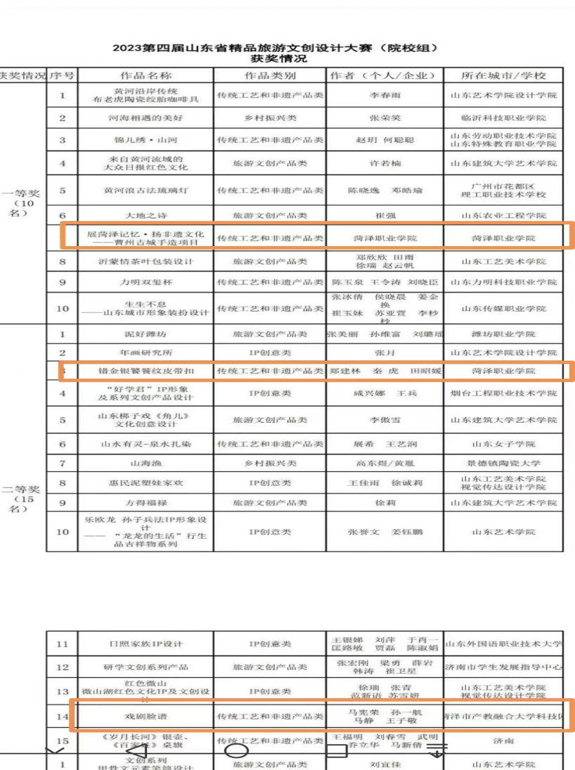 据了解,“2023第四届山东省精品旅游文创设计大赛”,以“沿着黄河遇见海”为创作方向,征集创作彰显黄河文化特色、提升黄河品牌价值的优秀文创产品。共收到来自全国20多个省市、自治区的文创工作者、非遗匠人及院校师生的投报作品5000余件,涌现出一大批艺术形式多样、题材广泛、风格多元的独具黄河魅力的高质量文创产品。其中,我校三项作品在2023第四届山东省精品旅游文创设计大赛中获奖:学前教育系报送的作品“展菏泽记忆·扬非遗文化——曹州古城手造项目”获一等奖;菏泽市产教融合大学科技园报送的作品“错金银饕餮纹皮带扣”和“戏剧脸谱”均获二等奖。