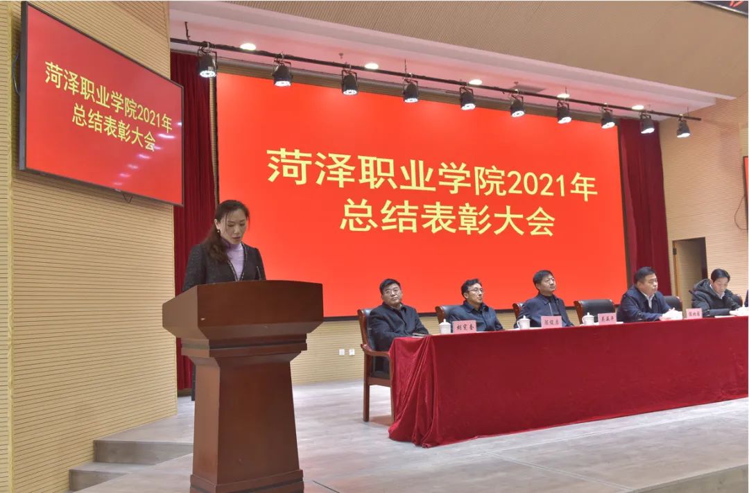 会议在庄严的国歌声中缓缓拉开帷幕。会上,党委委员、副院长王朝景同志公布了菏泽职业学院2021年度十件大事,党委副书记吴亚平同志宣读了《菏泽职业学院2021年高质量发展表彰决定》。随后,隆重表彰了在学院高质量发展和教育教学方面涌现出来的先进集体和个人。先进集体代表徐冉、职业技能大赛获奖指导教师代表黄莹和教学能力大赛获奖教师代表申静进行了精彩的发言。