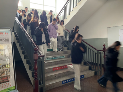 演练前,各班通过班会学习“弯腰捂鼻、靠右行走”等逃生要点。演练开始后,各班迅速组织学生捂住口鼻、弯腰低姿,按预定路线有序撤离至安全区域。